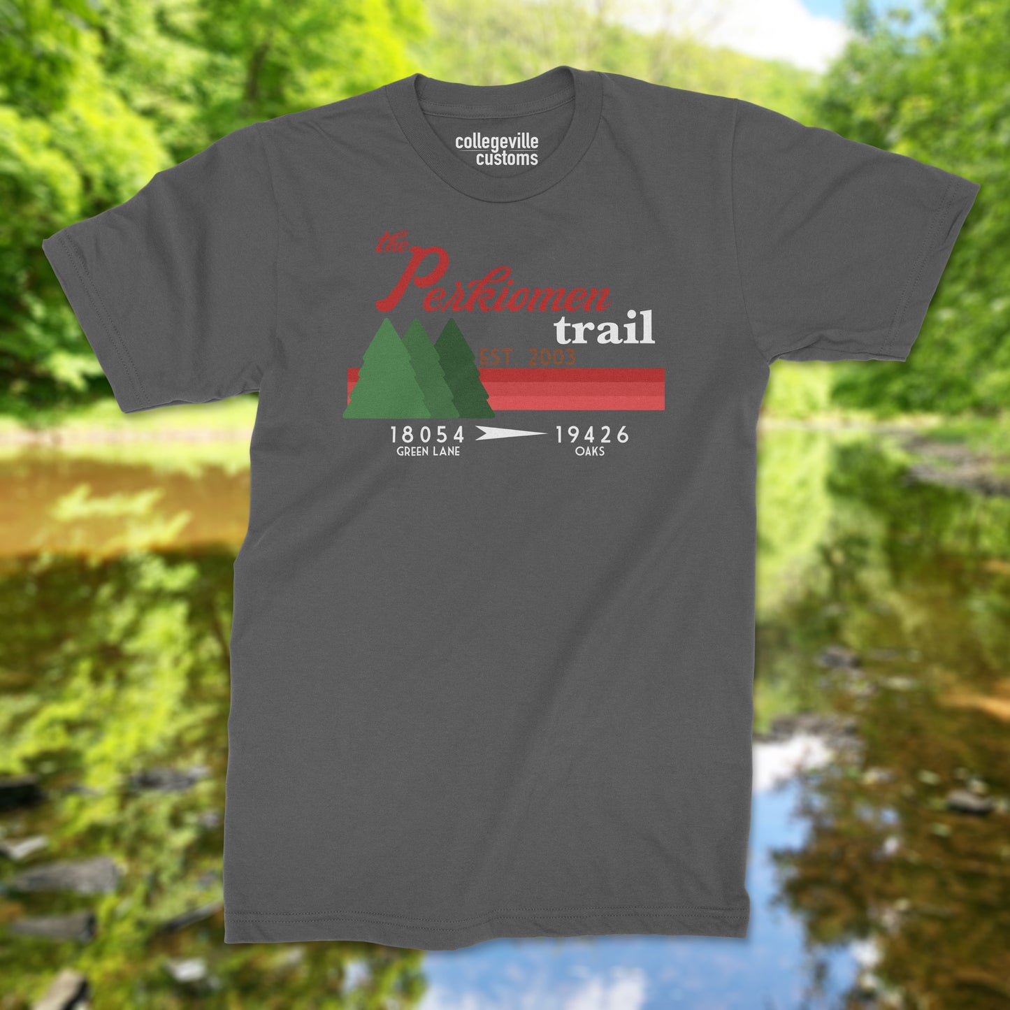 One of the shining examples of stunning natural beauty in the Greater Philadelphia Area. The Perkiomen trail, having a bountiful assortment of North American foliage and wildlife, is an asphalt trail stretching 20.6 miles. This incredible trail starts in Green Lane and ends in Oaks near Audubon PA. This tank top celebrates the incredible beauty and complexities that are found on the trail. Both zip codes are proudly displayed underneath the design.